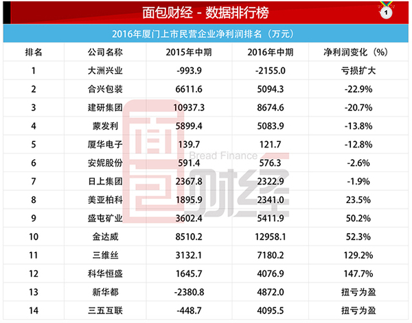 財報數據顯示:除去新上市的5家公司外,當前廈門14家民營上市公司中有7家2016年上半年凈利潤出現了下滑,占總數的一半。下表為面包財經(微信公眾號:mbcaijing)根據上市公司數據繪制的廈門上市民企凈利潤: