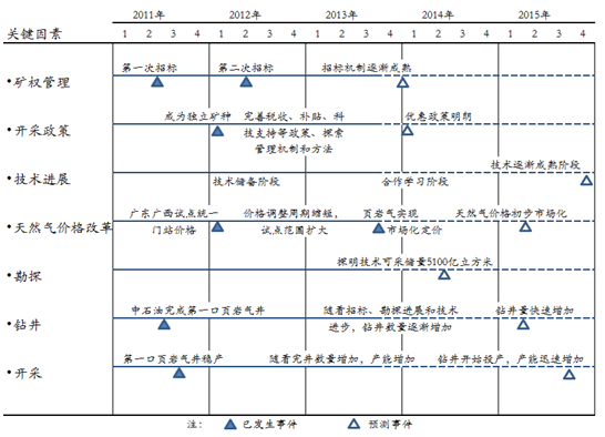 結(jié)合前文中國(guó)的頁巖氣資源分布情況、頁巖氣技術(shù)進(jìn)展、政策、礦權(quán)管理、頁巖氣項(xiàng)目進(jìn)展等情況,中國(guó)頁巖氣發(fā)展時(shí)間表如下圖所示。