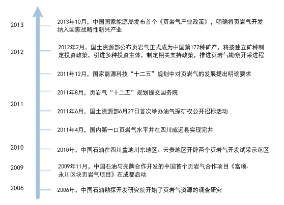 圖3 中國(guó)頁巖氣發(fā)展歷程(截至2013年,2014至今頁巖氣發(fā)展緩慢)