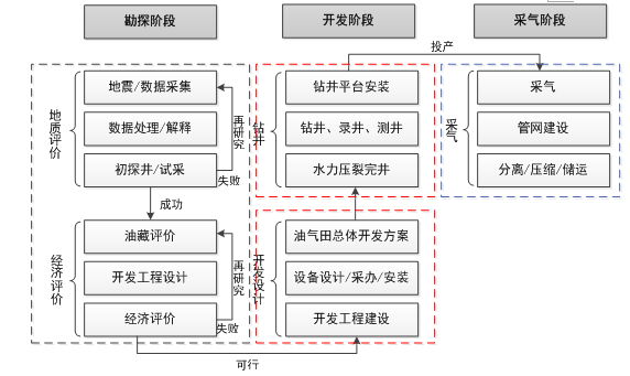 頁巖氣區(qū)塊的開發(fā)流程分為勘探、鉆井和采氣三個(gè)階段。總體而言,中國(guó)頁巖氣開采仍處于探索及實(shí)驗(yàn)階段。中石油、中石化和延長(zhǎng)油田已分別打出了頁巖氣試驗(yàn)開采井,但目前中國(guó)還沒有形成頁巖氣工業(yè)化產(chǎn)量。