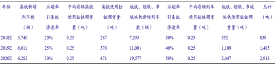 永磁地鐵從 2012 年首次試運行到 2016 年正式裝載運行經過了 4 年時間,未來市場份額將快速擴大;而正在試運行中的永磁高鐵最早 在 2017 年即可正式裝載運行。保守估計 2018 年以后,中國將加速進入永磁軌道交通時代。預 計至 2020 年新增高鐵、城市軌道交通列車中分別有 30%和 50%采用永磁同步傳統系統。目前 一輛永磁列車使用高性能稀土永磁約為 0.25 噸,則 2020 年,軌道交通領域使用高性能稀土永 磁材料有望達到 2,918 噸。相信 2025 年之前,永磁列車將成為軌道交通領域的主力軍,屆時 每年軌道交通用高性能釹鐵硼材料的消費量可達萬噸,而我國現階段高性能釹鐵硼材料的產量 不足 5 萬噸,因此未來軌道交通領域將對高性能釹鐵硼材料的需求具有強烈的拉動作用。