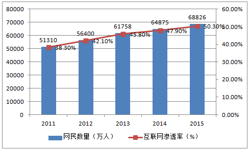 2011-2015年中國網民數量及互聯網滲透率