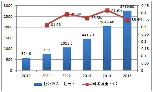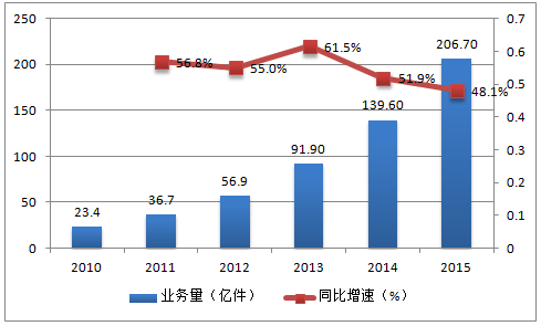 受益于電子商務的高速增長,我國快遞業雖然起步較晚,但發展極快。2015 年,中國快遞業務量達到206.7 億件,同比增長48%,2010-2015 年的復合增速為43.7%;收入規模達到2770 億元,同比增長35%,2010-2015 年的復合增速為30.0%。近兩年快遞業件量和收入增速雖然有所下滑,但考慮到網購市場空間和國內快遞市場巨大的地域差異,預計行業未來3-5 年仍將保持較高增速。同時快遞行業的高速發展也為網絡購物提供了良好的基礎。