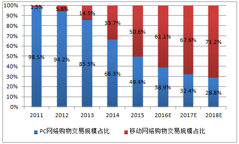 2011-2018年中國網購交易額PC端和移動端占比預測