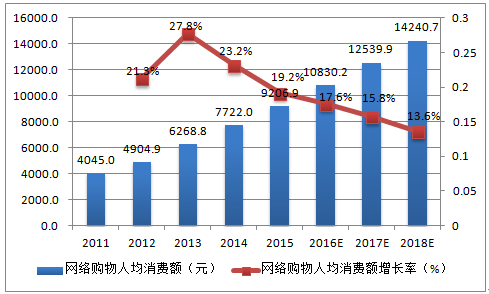 2011-2015年我國網絡購物人均消費額持續增長。2015年網絡購物人均消費額為9206.9元,是2011年的2.3倍,同比2014年增長19.2%。