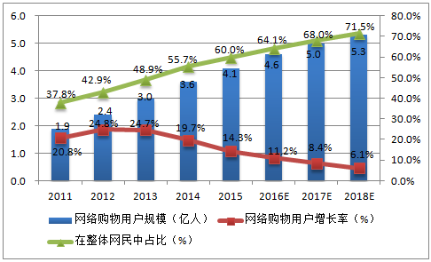 2011-2015年我國網絡購物用戶規模持續增長。2015年網購用戶總規模達4.1億人,是2011年的2.1倍,2015年網絡購物用戶規模增長率為14.3%。隨著互聯網的發展、觸網用戶增加以及網購方式的越來越流行,未來網購用戶在整體網民中的比例將越來越高。