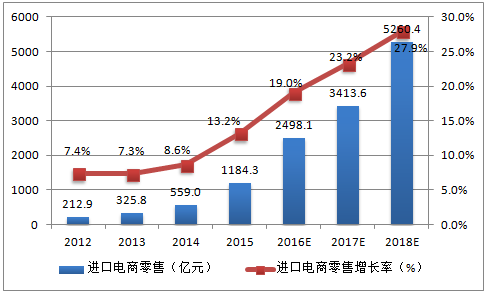 隨著2014年下半年進口電商零售政策的放開,大量內貿電商和創業企業涌入進口電商零售市場。2015年,該市場的市場規模達到1184.3億元,增長率為111.9%,在進口電商中的滲透率達13.2%。未來幾年,在政策基本面保持利好的情況下,進口電商零售市場仍將保持平穩增長。