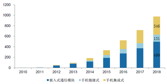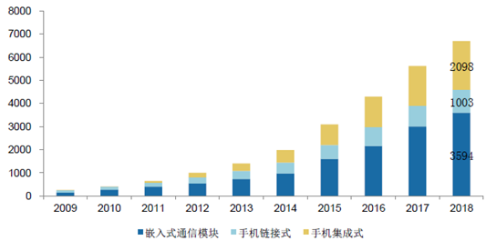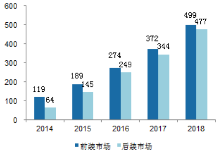 前裝市場仍為主體,后裝市場高速增長。根據(jù)SBD 的預(yù)測,到2018 年,前裝車載終端(嵌入式)規(guī)模達到499 萬臺,后裝配車載終端(OBD模式)達到477 萬臺。假設(shè)一套嵌入式終端價格為5000 元,嵌入式和手機集成式終端價格為1000 元,到2018 年前裝終端市場規(guī)模達到250億元,后裝市場規(guī)模接近48 億元,整體市場規(guī)模接近300 億元。