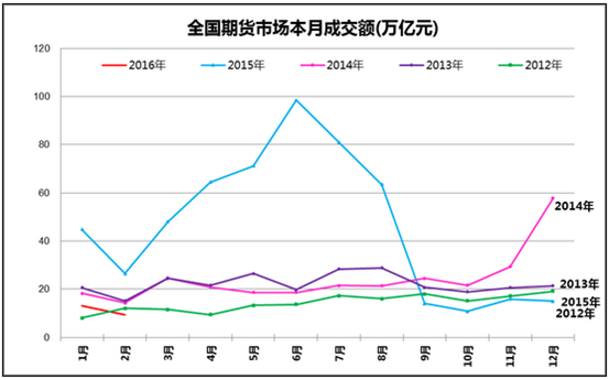 從金融期貨市場來看,2016年前2個月全國金融期貨市場累計成交量為0.032億手,累計成交額為3.15萬億元,相比2015年前2個月累計成交量為0.5億手和53.76萬億元,同比大幅萎縮93.6%和94.14%。2016年初的金融期貨市場活躍度遠(yuǎn)低于2015年初,這也成為全國期貨市場成交額大幅下滑的主要原因。