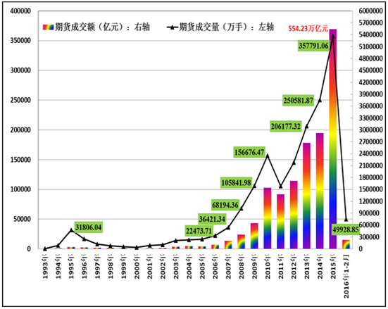 1993-2016年中國期貨市場成交量和成交額年度變化