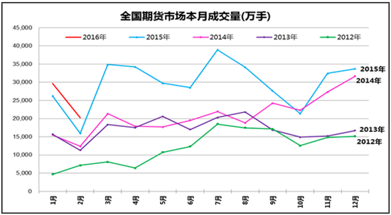 2016年前2個月全國期貨市場累計成交量為4.99億手,累計成交額為22.67萬億元,同比分別增長18.23%和下降68.21%。2月全國期貨市場成交量為2.02億手,成交額為9.47萬億元,同比分別增長26.57%和下降64.33%,環(huán)比分別下降31.98%和28.19%。2月份當(dāng)月的成交額指標(biāo)創(chuàng)出2011年2月以來新低,成交量水平仍屬正常范圍內(nèi),主要原因是金融期貨不活躍和商品價格普遍還處在底部。