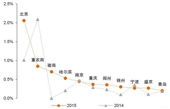 截至2015年12月末,全國134家城商行資產總額22.68萬億元,占銀行業金融機構總資產11.38%,較2007年約6%的水平幾乎翻了一倍。過去幾年城商行及農商行也迎來新一輪上市潮,接連在H股掛牌。這些銀行往往也是較早試水同業業務,從中獲益頗多的群體。