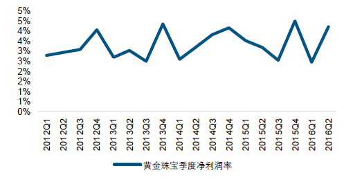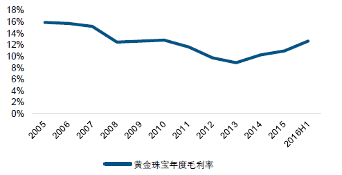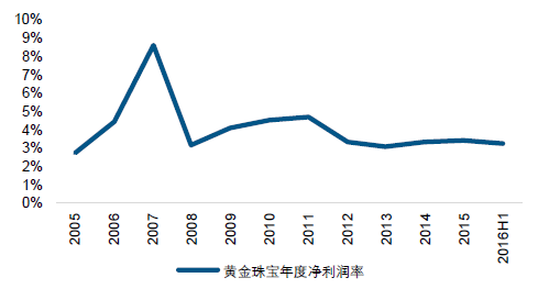 2005-2016H1 黃金珠寶行業凈利潤率水平