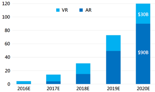 2016 年至 2020 年 AR/VR 行業總盈利預測(單位:十億美元)