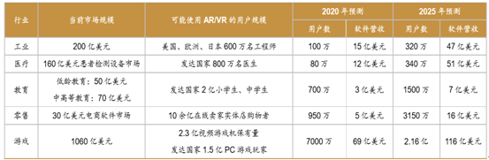 受限于 AR 硬件設備(特別是頭戴設備)尚不成熟,軟件領域的發展或將滯后,但從長 期來看,其市場規模是十分可觀的。根據高盛的預測,2025 年全球 AR/VR 軟件行業整體規 模將達到 350 億美元。前文已述,高盛對 AR/VR 的預測偏保守,所以從市場規模極有可能 超過這一預測數字。按照應用場景劃分,AR 類軟件和 VR 類軟件基本上平分天下,前者主 要服務于行業應用,后者則面向個人娛樂消費市場。
