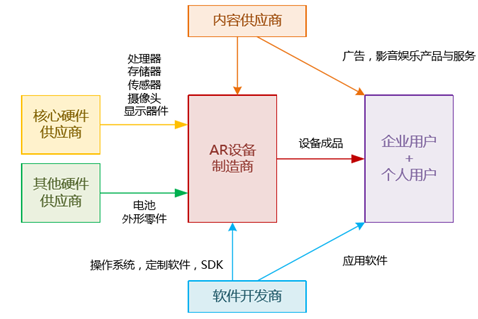 總體上,AR 市場可以劃分為硬件和軟件兩部分。以芯片制造商為代表硬件供應商占據 價值鏈最頂端,是 AR 設備制造的起點,負責為 AR 設備制造商提供處理器、傳感器、顯示 裝置、電源等產品。軟件供應商以及內容供應商為 AR 設備制造商提供定制化的產品和服務 (如 AR SDK 開發套件,應用軟件,云服務等),同時也直接面向個人用戶或企業用戶。