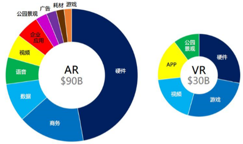 根據預測,AR/VR 行業到 2020 年總盈利規模將達到 1200 億美元,AR 占比 75%。從細分應用結構上看,硬件設備是 AR/VR 行業的主要盈利來源,AR 應用場景 (盈利來源)比 VR 豐富。從地域結構上看,亞洲國家將切分近 50%的市場蛋糕,中國、日 本、韓國、印度有望成為 AR/VR 的主要市場。