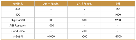 各機構對 AR/VR 行業市場規模預測對比(單位:億美元)