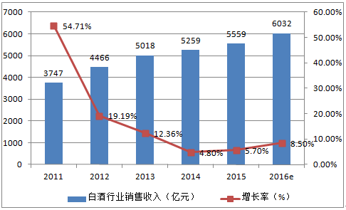 2011-2016年白酒行業(yè)銷售收入及增長趨勢