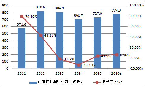 2011-2016年白酒行業(yè)利潤總額及增長趨勢
