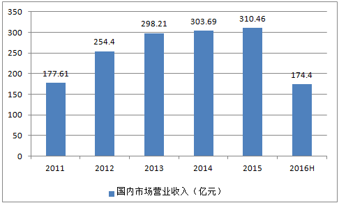 2011-2016年貴州茅臺國內市場營業(yè)收入趨勢