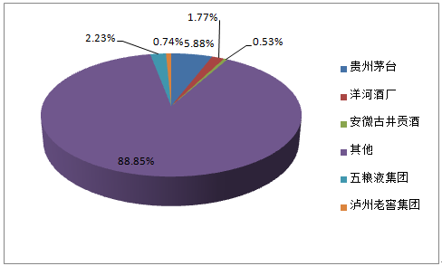 2015年,中國白酒行業(yè)上市公司的市場占比分別是:貴州茅臺占比5.88%,位列第一。其次,五糧液集團2.23%、洋河酒廠1.77%、瀘州老窖0.74%和安徽古井貢酒0.53%。