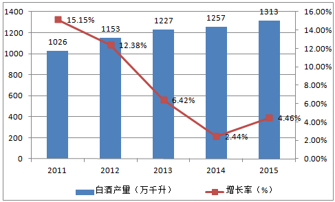 自2014年開始,白酒行業(yè)的產銷量增速均結束了連年下跌的局面,實現了微量的反彈。從產銷數據來看,2015年,白酒行業(yè)產量達到1313萬千升,同比增長4.46%;與此同時,白酒行業(yè)銷量達到1278.8萬千升,同比增長6.34%。白酒產銷數據連續(xù)兩年的持續(xù)攀升,證明了中國白酒市場供求格局的改變,可以看作白酒行業(yè)復蘇的標志。