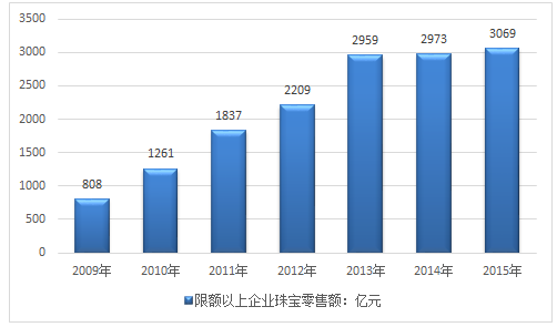 2009-2015年我國金銀珠寶行業限額以上企業商品零售額