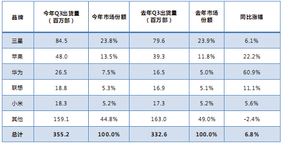 2015年第三季度全球手機市場銷量排行榜數據統(tǒng)計: