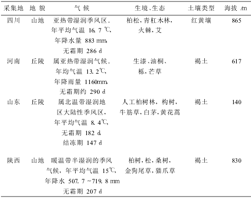 丹參的生態(tài)適應(yīng)強(qiáng),廣布于我國華北、華東、中南,西北、西南部分省區(qū)。從市場調(diào)查來看僅山東平邑、沂南、萊蕪,河南盧氏、靈寶、活寧、嵩縣,武當(dāng)山等地有少量野生藥材商品。通過對主產(chǎn)區(qū)四川、河南、山東和陜西野生丹參調(diào)查,其生態(tài)環(huán)境情況見表。
