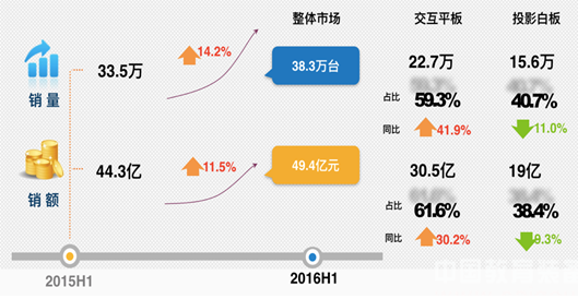 2016年,是國家教育信息化十年規劃的第六個年頭,得益于國家政策的支持、教育市場需求的刺激,教育信息化裝備市場發展持續升溫。報告顯示,2016上半年IWB的整體市場出貨量高達38.3萬臺,同比增長14.2%,銷售額高達49.4億元,同比增長11.5%。其中交互智能平板優勢明顯,市場銷量份額高達59.3%,同比增長41.9%。
