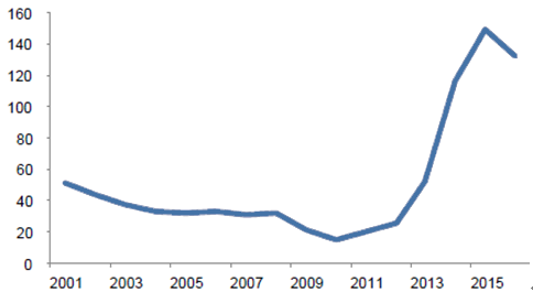 2001-2015年國內(nèi)玉米庫存消費比
