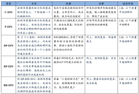 根據(jù)助力電機裝配位置的不同,EPS可以分為轉(zhuǎn)向柱助力式 (C-EPS)、小齒 輪助力式 (P-EPS)、雙小齒輪助力式(DP-EPS)、齒條平行式(RP-EPS)、齒條 助力式(RD-EPS)五種。其中,C-EPS結(jié)構(gòu)簡單、緊湊,制造成本低,工藝及后期 維護和保養(yǎng)相對簡單,因此國內(nèi)主要采用C-EPS居多。