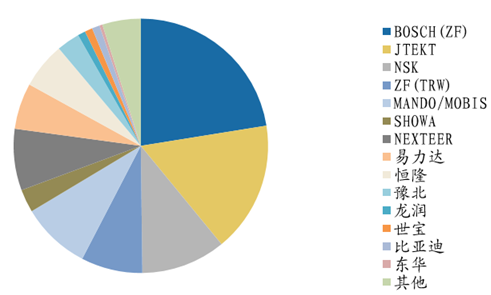 目前我國EPS供應(yīng)商主要為外資和合資企業(yè),國產(chǎn)EPS產(chǎn)品的應(yīng)用集中在微型車 領(lǐng)域。 2015年國內(nèi)EPS產(chǎn)品銷量總計為1205萬件,其中,國際品牌供應(yīng)商的總銷售 量為878萬件,占比為81%,博世、捷太格特分別以23%和17%占據(jù)前兩大市場份額, ZF以9%的份額緊隨其后;國內(nèi)自主品牌供應(yīng)商的總銷量為229.3萬臺,占比為19%, 主要供應(yīng)商為易力達、恒隆、豫北,市場份額分別為6%、6%和3%。