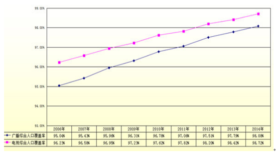 截至 2014 年末,電視綜合人口覆蓋率達到 98.60%,有線廣播電視入戶率達到 54.82%,數字電視滲透率達到 81.61%,雙向網絡覆蓋用戶超過 1.08 億戶,開通雙向業務用戶超過 3,695 萬戶; 衛星電視用戶全部數字化, 戶戶通用戶近 1,872萬戶,村村通工程即將完成。天津、內蒙古、浙江、湖南、貴州、寧夏、西藏等地數字化率達到了約 90%。2006-2014年廣播電視人口綜合覆蓋率