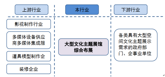 大型文化主題展館綜合布展領域的上游行業企業主要包括影視動畫制作企業、多媒體設備供應商、多媒體集成服務商、道具模型制作企業、裝修企業;下游行業為各類具有大型空間文化主題展示需求的政府部門、企事業單位。具體情況見下圖:
