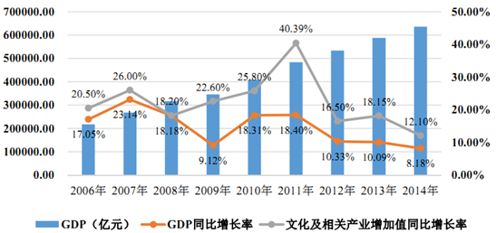 2006-2014年我國GDP、文化及相關產業同比增長情況
