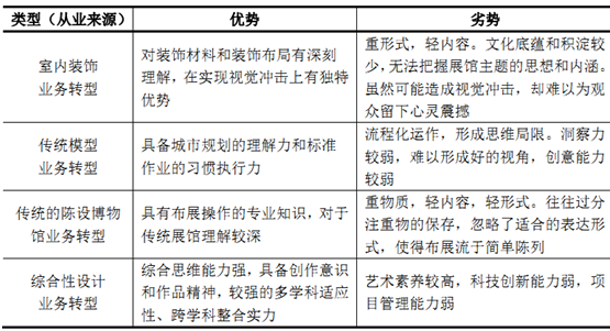 隨著空間環境藝術設計行業競爭的不斷加劇,為了爭取市場份額,企業需具備更有競爭力的創意設計能力, 擁有豐富設計經驗及成功案例的設計企業占據著穩定的市場地位。 本公司主營業務屬于空間環境藝術設計行業中的大型空間文化主題展館布展領域,是集合創意創作、平面設計、軟件開發、影視創作于一體的文化產業。展館布展在我國屬于朝陽行業,市場發展前景廣闊,目前市場上的展館布展服務商并非是自成立以來就從事于城市文化館、博物館、企業文化館等布展業務,根據最初的從業來源不同,從公司的主要業務產品大型空間文化主題展館展覽展示系統的細分行業來看, 該領域內各類型企業的競爭優劣勢比較分析如下: