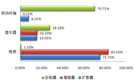 從這三種產(chǎn)品的應(yīng)用領(lǐng)域來看,反射膜的應(yīng)用主要集中于移動終端領(lǐng)域,占比為70.72%,增亮膜和擴散膜的應(yīng)用主要集中于電視領(lǐng)域,占比分別為83.45%和75.73%