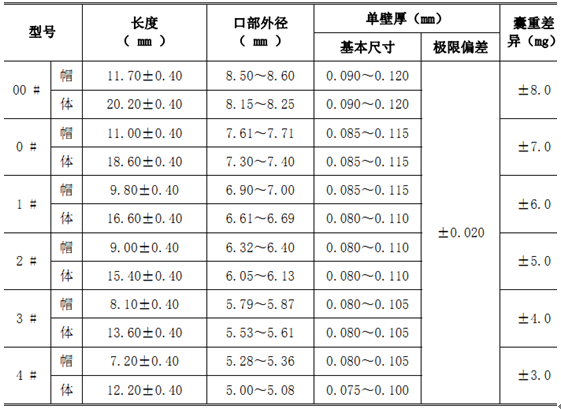 藥用空心膠囊是由可套合和鎖合的帽和體兩節組成的質硬且有彈性的空囊,呈圓筒狀。按帽、體的不同規格尺寸,藥用空心膠囊可分為 00#、0#、1#、2#、3#、4#等型號。根據中國醫藥包裝協會發布的《<明膠空心膠囊>協會標準》(YBX-2000-2007) ,相關參數如下: