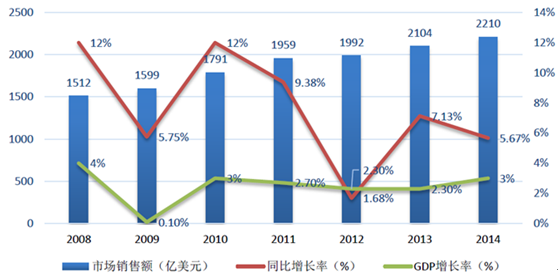全球醫療電子市場在移動醫療、智慧醫療、遠程醫療等醫療新模式的帶動下,正處于穩步增長階段。2014年市場銷售額約2255億美元,同比增長5.67%。