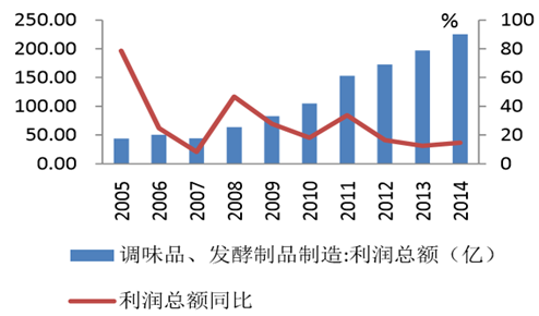2014 年我國醬油、醋及類似制品收入規模達到 904 億,占調味品的收入比重約為 34%,2015 年 1-10 月延續這一趨勢占比增至 35%,規模達 796 億元。自 2003 年起,醬醋及類似產品 的復合增速達到 24%,收入增速快于調味品行業整體增速,是調味品行業增長的主力軍, 且盈利能力不斷提升,利潤總額復合增速達到 40%,利潤份額提升至 40%。2015 年 1-10 月利潤總額達 97 億元,占行業總利潤的份額進一步提升至 46%,利潤收入比為 12.17%, 增長速度高于整個調味品行業。