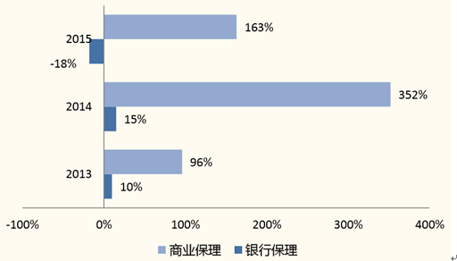 2013 - 2015 年銀行保理和商業保理業務增速對比