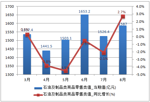核心提示:2016年8月中國限上單位石油及制品類商品零售類值為1587億元,同比增長2.7%;2016年1-8月中國限上單位石油及制品類商品零售類值為11927億元,同比增長-0.9%。2016年中國限上單位石油及制品類商品零售類值及增速 數(shù)據(jù)來源:2016年8月中國限上單位石油及制品類商品零售類值為1587億元,同比增長2.7%;2016年1-8月中國限上單位石油及制品類商品零售類值為11927億元,同比增長-0.9%。