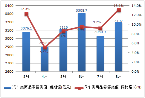 核心提示:2016年8月中國限上單位汽車類商品零售類值為3197億元,同比增長13.1%;2016年1-8月中國限上單位汽車類商品零售類值為24479億元,同比增長8.6%。2016年中國限上單位汽車類商品零售類值及增速 數(shù)據(jù)來源:國家統(tǒng)計局,智研咨2016年8月中國限上單位汽車類商品零售類值為3197億元,同比增長13.1%;2016年1-8月中國限上單位汽車類商品零售類值為24479億元,同比增長8.6%。