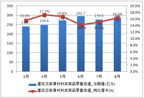 核心提示:2016年8月中國(guó)限上單位建筑及裝潢材料類(lèi)商品零售類(lèi)值為288億元,同比增長(zhǎng)16.3%;2016年1-8月中國(guó)限上單位建筑及裝潢材料類(lèi)商品零售類(lèi)值為2011億元,同比增長(zhǎng)15.6%。2016年中國(guó)限上單位建筑及裝潢材料類(lèi)商品零售類(lèi)值及增速2016年8月中國(guó)限上單位建筑及裝潢材料類(lèi)商品零售類(lèi)值為288億元,同比增長(zhǎng)16.3%;2016年1-8月中國(guó)限上單位建筑及裝潢材料類(lèi)商品零售類(lèi)值為2011億元,同比增長(zhǎng)15.6%。
