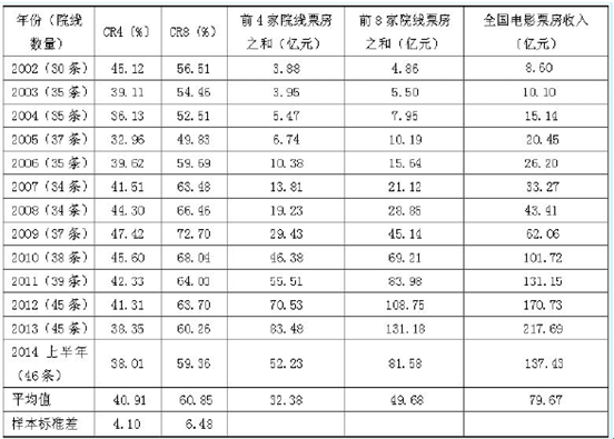 市場集中度是衡量某一產業組織結構的重要指標,是指產業內規模最大的前幾位企業的銷售額占整個產業的份額,可用CR4或CR8表示,即院線產業內前4家或前8家院線的票房收入之和占整個國內票房收入的比率。
