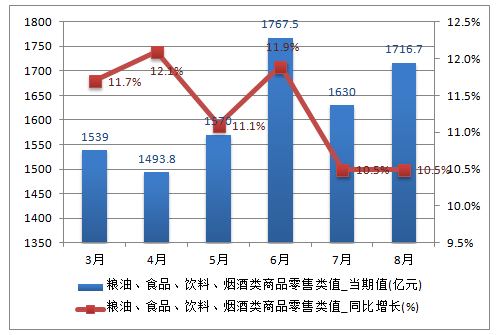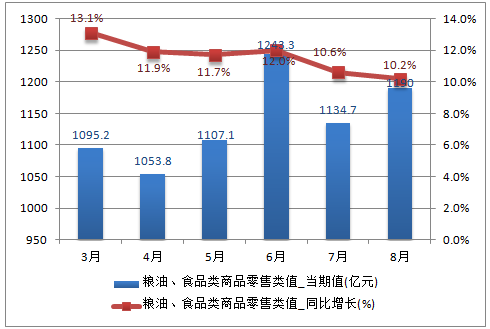 2016年8月中國限上單位糧油、食品類商品零售類值為1190億元,同比增長10.2%;2016年1-8月中國限上單位糧油、食品類商品零售類值為9329億元,同比增長11.8%。