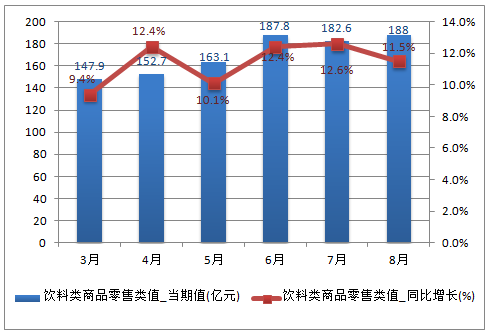 2016年8月中國限上單位飲料類商品零售類值為188億元,同比增長11.5%;2016年1-8月中國限上單位飲料類商品零售類值為1354億元,同比增長11.1%。
