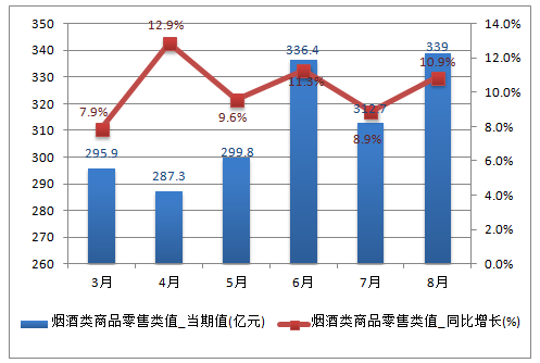 2016年8月中國限上單位煙酒類商品零售類值為339億元,同比增長10.9%;2016年1-8月中國限上單位煙酒類商品零售類值為2664億元,同比增長9.4%。
